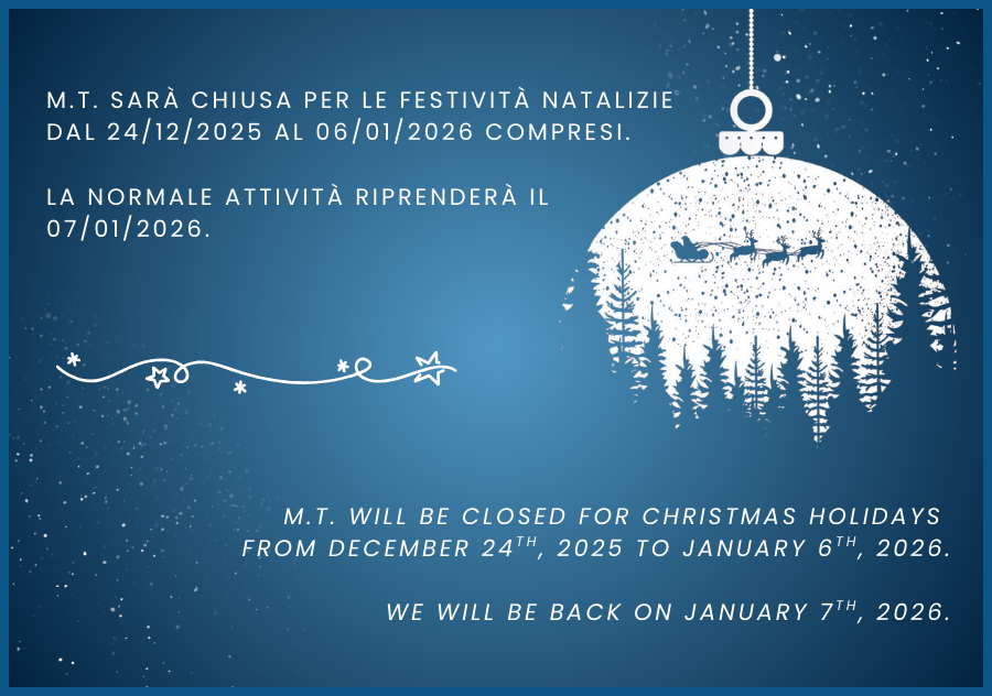 M.T. будет закрыта на Рождественские праздники с 24 Декабря 2025 до 6 Января 2026 включительно.